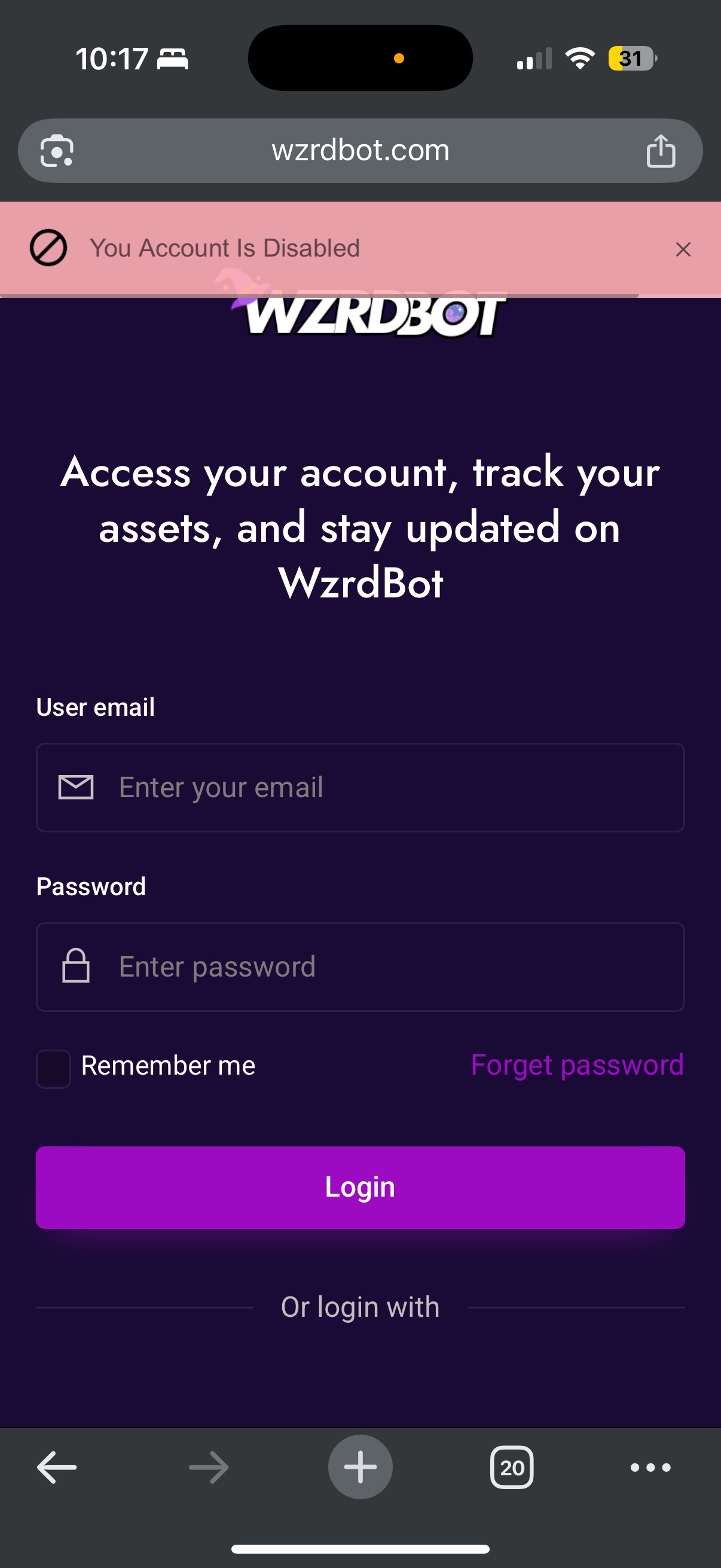 Shortly after joining, the user was deleted from the wzrdbot discord and their account was disabled on the wzrdbot.com web site. The user was unable to access support and was unable to access their funds. The following screenshot shows what the user receives when trying to login to the website to access their funds.